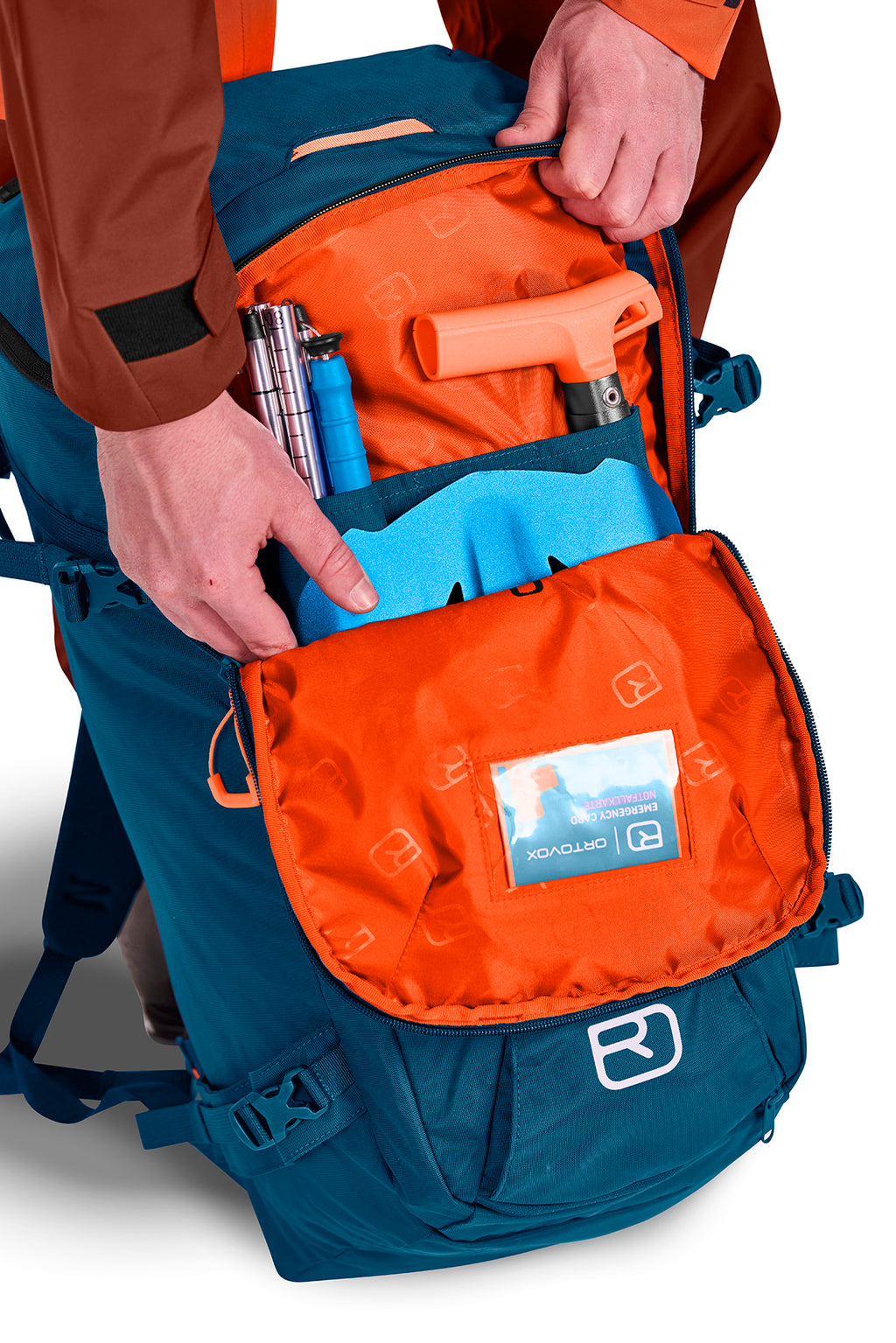 Mit seinem größeren Volumen passt in den HAUTE ROUTE 40 alles hinein, was dabei sein sollte. Das geräumige Hauptfach ist von oben und vom Rücken zugänglich, sodass alle Sachen schnell bei der Hand sind, während das separate Sicherheitsfach gleichzeitig den schnellen Zugriff auf die Notfallausrüstung garantiert. Dank Seilfixierung am Rucksackdeckel kann zudem ein mitgeführtes Seil schnell ein- oder ausgepackt werden, ohne den Deckel öffnen zu müssen. Neben Steigeisenfixierung, Pickel- und Stockbefestigung sowie fixiertem Helmnetz stehen zusätzlich flexible Tragebefestigungen z.B. für ein Snowboard zur Verfügung. Die Ski lassen sich klassisch als auch diagonal am Skitourenrucksack befestigen.