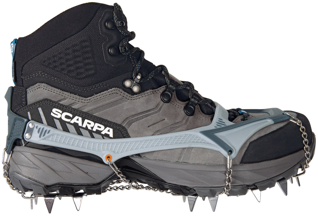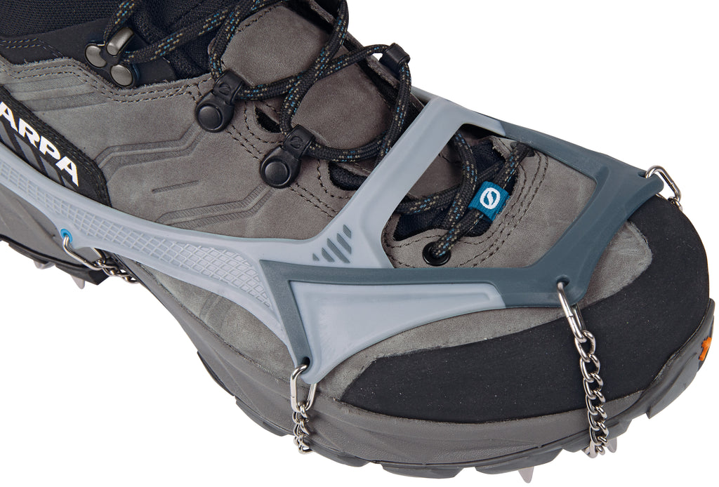 Leistungsstark, leicht und robust - Ice Master Pro ist das ultimative Grödel. Ein vielseitiges Produkt im Namen der Innovation, das sich durch ein neues 3D-Befestigungssystem aus 2 Materialien auszeichnet. Es ist weicher und anschmiegsamer, wo Anpassungsfähigkeit gefragt ist, und steifer und robuster, wo Halt benötigt wird. Die Innovation liegt auch in der minimalistischen Struktur aus rostfreiem Stahl mit einem doppelten Gelenk am Vorderteil, das eine perfekte Anpassung an jede Sohle und ihre Verformung beim Gehen garantiert. Die 16 Zacken sind so angeordnet, dass sie die Traktion, den seitlichen Halt und das Abbremsen bei Schnee, Eis oder auf rutschigem Untergrund (Schlamm, nasses Gras, Flechten überwachsenen Felsen usw.) optimieren. Die Mikrogliedketten aus rostfreiem Stahl tragen zur Leichtigkeit und Wesentlichkeit des Produkts bei. Die mitgelieferte leichte und kompakte Box vervollständigen das Angebot und macht das Ice Master Pro zu einem Produkt, das man immer im Rucksack haben sollte, um in aller Sicherheit lange Wanderungen, Hochtouren und Trekking zu unternehmen. ACHTUNG: in technischem Gelände ersetzt das Ice Master Pro keine klassischen Steigeisen.